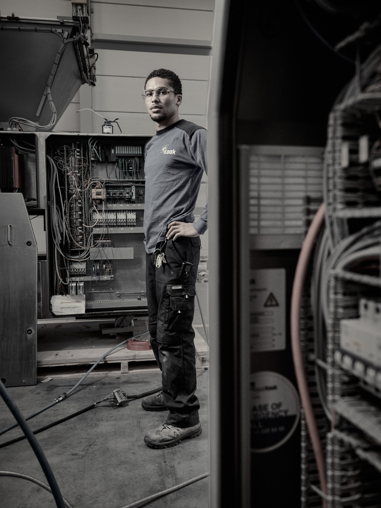 Ik doe bijna alles: samenstellen, opbouwen, testen, programmeren, installeren en storingen oplossen. Dat maakt het werk super­afwisselend. Binnenkort mag ik doorgroeien naar de tekenkamer, maar eerlijk gezegd vind ik het sleutelen nog té leuk. Eén ding weet ik zeker: hier wil ik blijven. De industriële automatisering past echt bij mij.’